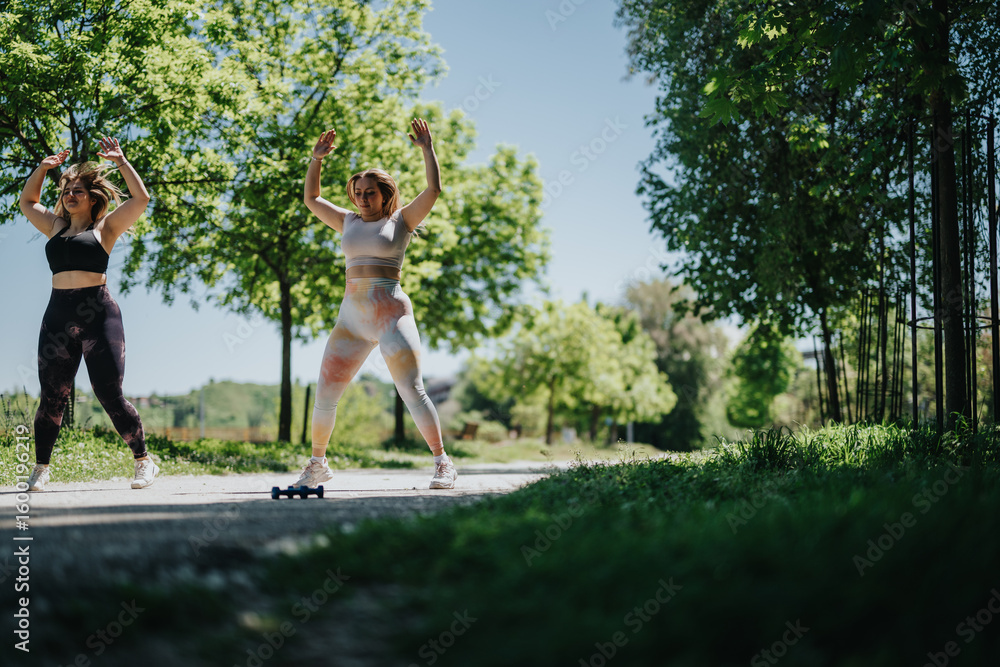 Two young women performing workouts together in a scenic park under bright sunlight, surrounded by vibrant green trees, showcasing active lifestyles.