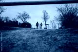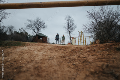 A pair of friends exploring a serene natural park, surrounded by bare trees and overcast skies. The tranquil environment highlights the beauty of nature and the enjoyment of interpersonal moments.