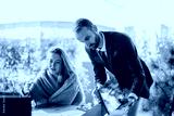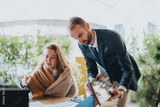 Two professionals discuss and review work together outdoors at a modern terrace workspace.