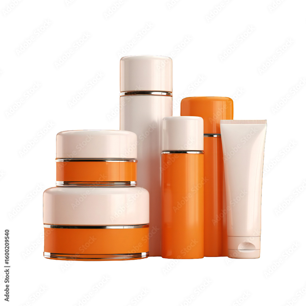 Elegant cosmetic product set featuring minimalist design in white and orange, isolated on transparent background