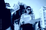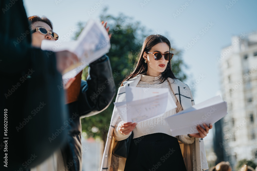 A group of business professionals discusses project documents outside under clear blue skies, demonstrating teamwork.