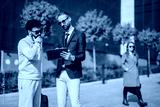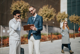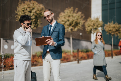 Two business people engage in a discussion with a tablet in a contemporary city environment. The focus is on collaboration and teamwork, surrounded by urban architecture and passersby.