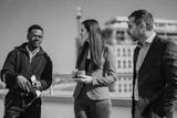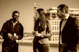 Group of business people having a meaningful conversation during a casual outdoor meeting, showcasing teamwork, collaboration, and professional attire under a clear sunny sky.