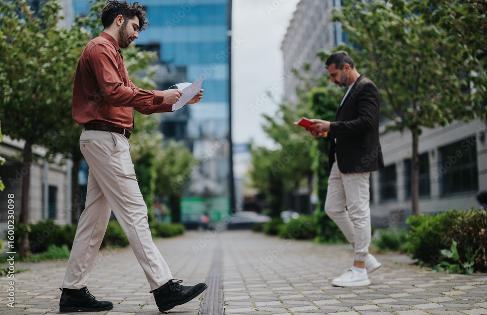Two men in a city street are seen walking and reading, one holding documents and the other a book. The scene captures a moment of focused activity within the urban environment.