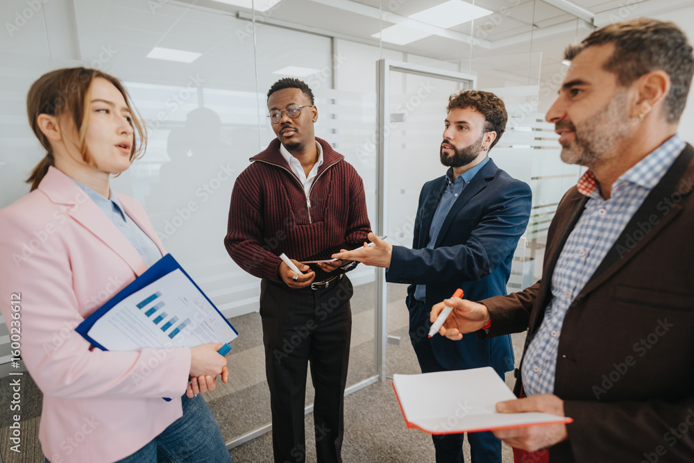 Group of professionals collaborating in a modern office, illustrating teamwork and effective communication.