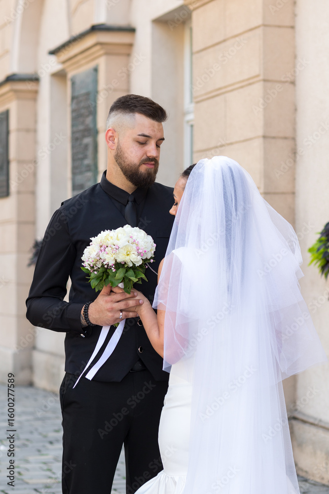 Close-up of bride and groom holding bouquet, looking at each other lovingly. Elegant wedding moment full of intimacy and emotion.