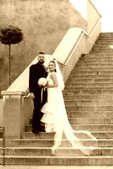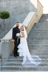 Bride and groom posing together on a stone staircase, the bride's long veil flowing down the steps. An elegant and timeless wedding moment.
