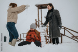 Three friends share a cheerful moment outdoors, engaging in snow play amidst a white wintry setting, radiating happiness and camaraderie
