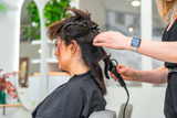 Hairdresser using curling iron on client in salon