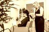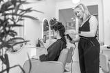 Hairdresser styling customer hair with curling iron in salon
