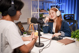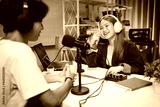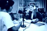 People in the podcast studio talking and recording