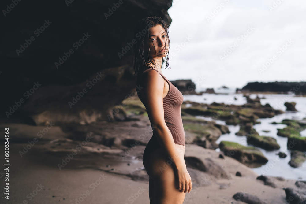 Young woman stands near rocks, gazing calmly into distance, expressing quiet defiance, natural confidence and grounded independence disconnected from digital pressure and noise.