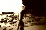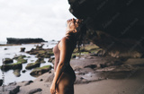 Woman tilts head toward sky under shadowed rock, wet hair falling back, symbolizing surrender, clarity and emotional rebalance away from constant alerts and online expectations.