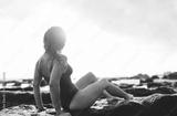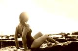Young woman leans back on moss-covered rock facing ocean, light embracing her silhouette, expressing freedom, surrender and a reset away from online chaos and performance.