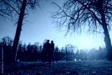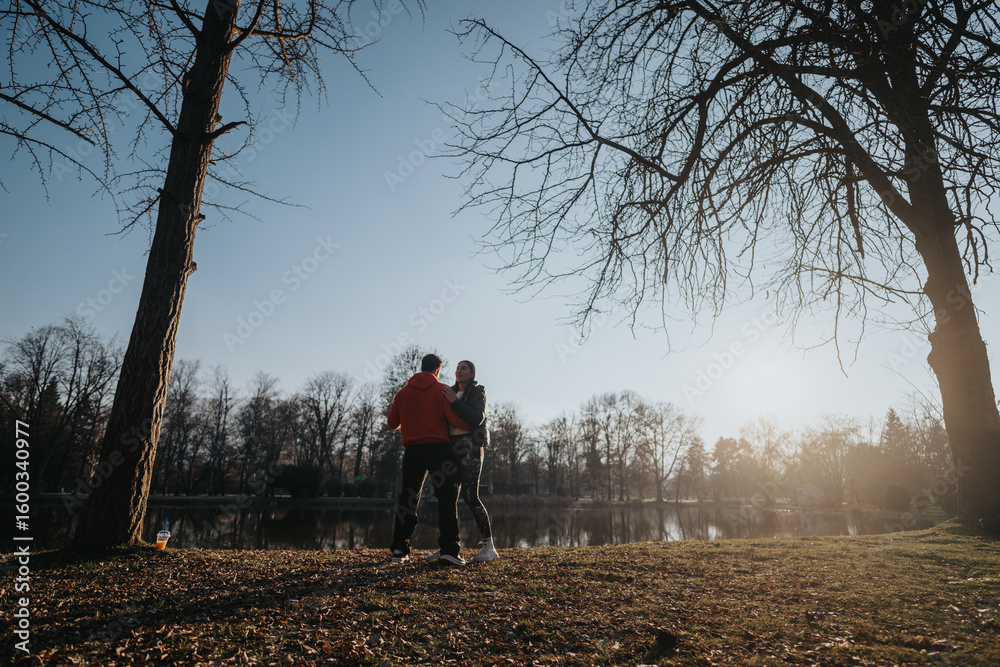 A couple shares a quiet moment under bare trees near a serene park pond during a scenic sunset.
