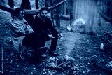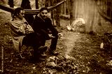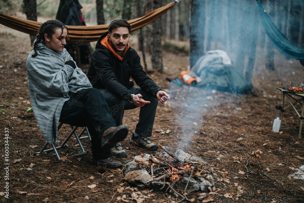 Two individuals sit by a campfire in a forest, engaging in conversation. The scene includes hammocks, a serene wilderness ambiance, and the preparation for an outdoor adventure.
