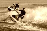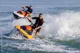 Two men riding jet skis side by side on the water. Concept friendship, adventure, and active lifestyle