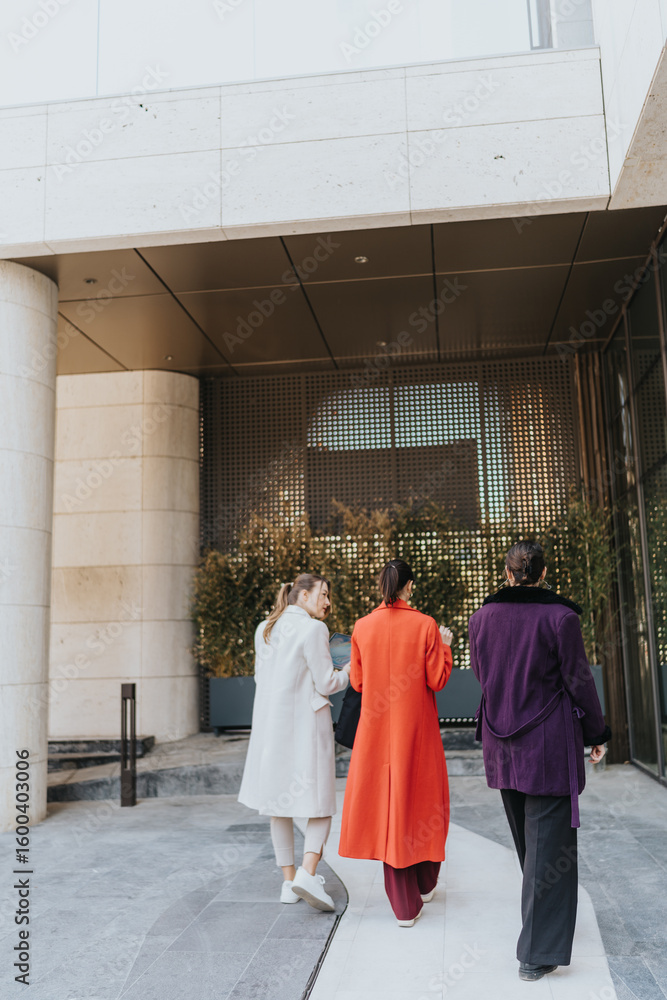 Group of women dressed in fashionable coats walking outside near a modern building, highlighting contemporary fashion, teamwork, and outdoor dynamics.