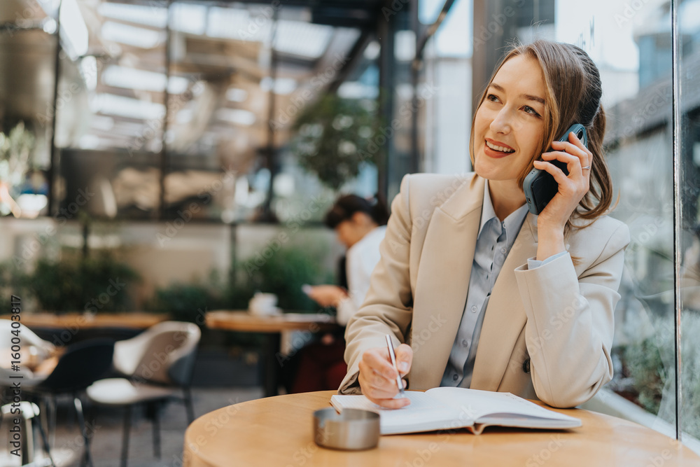 A businesswoman in a well-lit modern cafe jotting down ideas while talking on the phone, showcasing multitasking and professional communication.