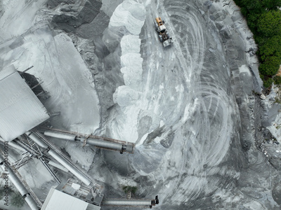 Top-down drone image of crushing plant and dust-covered trucks producing building aggregates, offering visual insight into the balance between infrastructure development and environmental footprint.