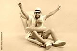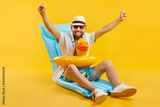 Happy funny excited man in sunglasses and hat sitting on inflatable mattress in duck rubber ring isolated on a studio yellow background. Overjoyed guy going to swim on a beach. Vacation concept.