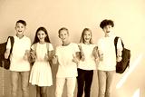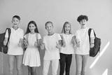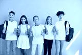 Happy elementary school kids give thumbs up. Group portrait of joyful smiling preteen male and female children in casual wear with backpacks standing by grey studio wall and showing thumbs up symbols