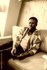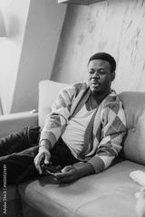 Man comfortably lounging on a couch in a warm cardigan, engaging with a gaming console controller, in a modern and cozy home environment.