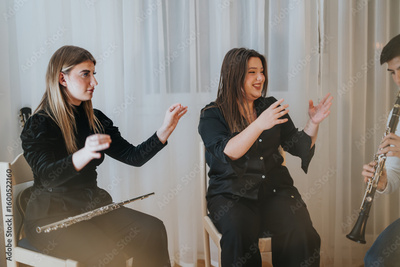 Musicians engage in a creative rehearsal, playing instruments and exchanging ideas in a relaxed setting.