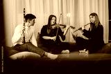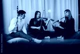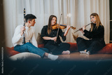 A clarinetist, violinist, and flutist seated on cushions, performing music in a relaxed ambiance. The warm indoor environment enhances the harmony and joy of their friendly musical gathering.