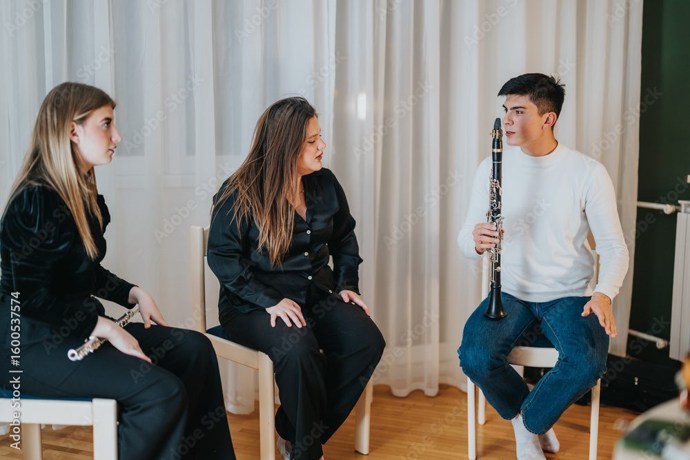 Three young adults engage in a musical lesson focusing on wind instruments within a cozy room.