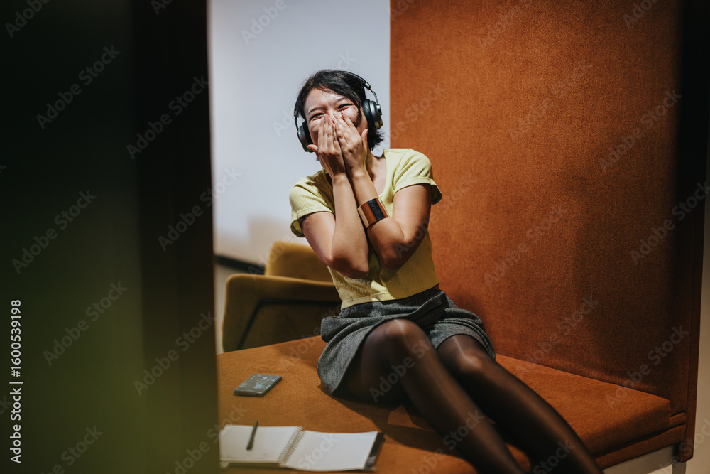 Joyful woman seated with headphones, laughing in amusement. A modern cozy atmosphere with casual elements emphasizes comfort and relaxation.