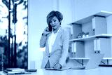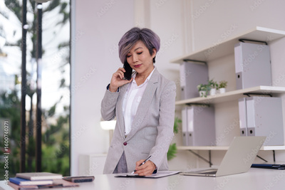 Asian adult businesswoman on phone writing document professional modern office workplace corporate communication task management