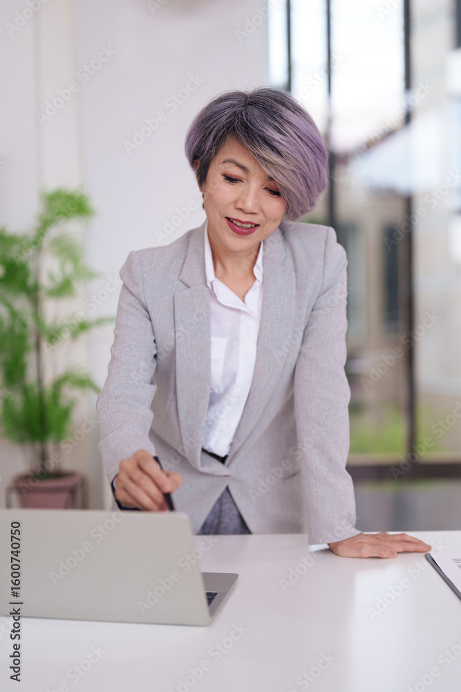 Asian adult businesswoman working on laptop computer at modern office desk professional female entrepreneur using technology for business growth