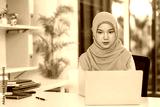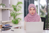 Muslim adult businesswoman focused laptop modern office remote work digital learning financial career