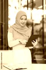 Young Adult Asian Muslim Businesswoman in Hijab Using Digital Tablet for Modern Enterprise Management in Corporate Office
