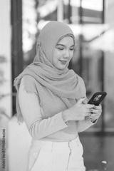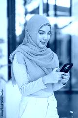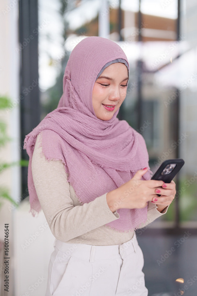 Smiling Asian adult Muslim businesswoman actively uses smartphone for online communication digital networking connecting professional opportunities at modern office setting