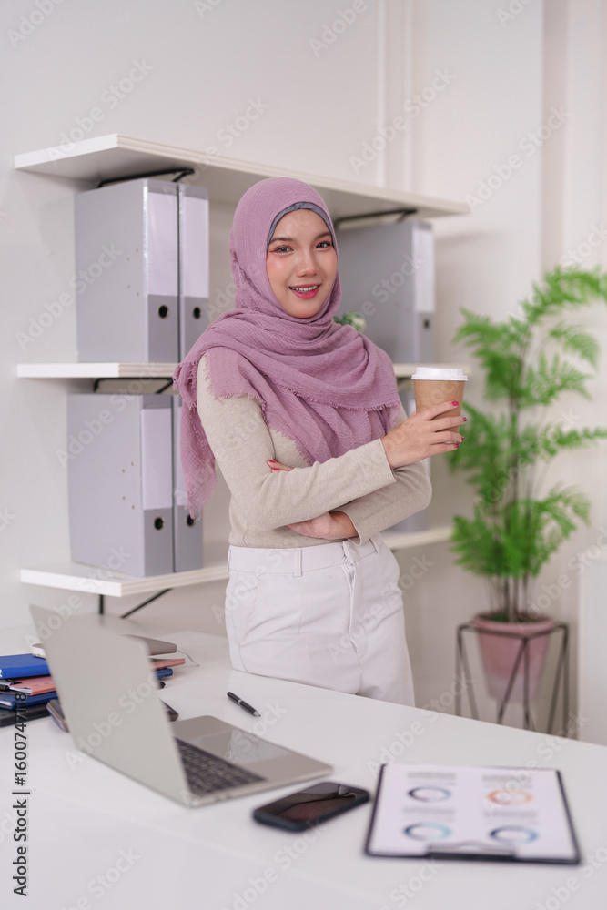 Young Asian Muslim businesswoman smiles holding coffee at modern office desk with laptop documents for career growth