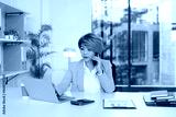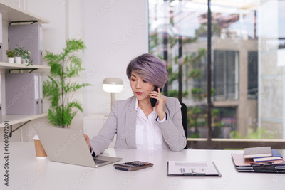 Asian adult female executive professional working modern office multitasking laptop phone call corporate business manager entrepreneur communication technology workspace efficiency