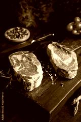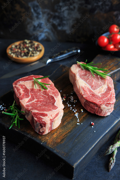 rohes entrecote steak auf holzbrett