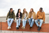 Group of diverse students relaxing and chatting on a brick wall, multiethnic people
