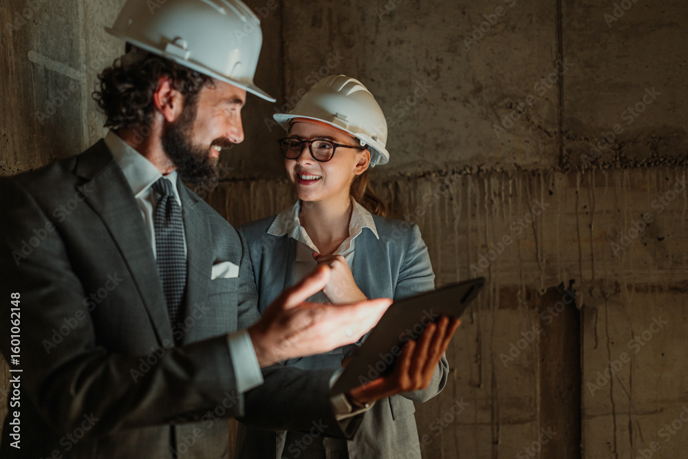 Architects discussing blueprint on tablet in building under construction