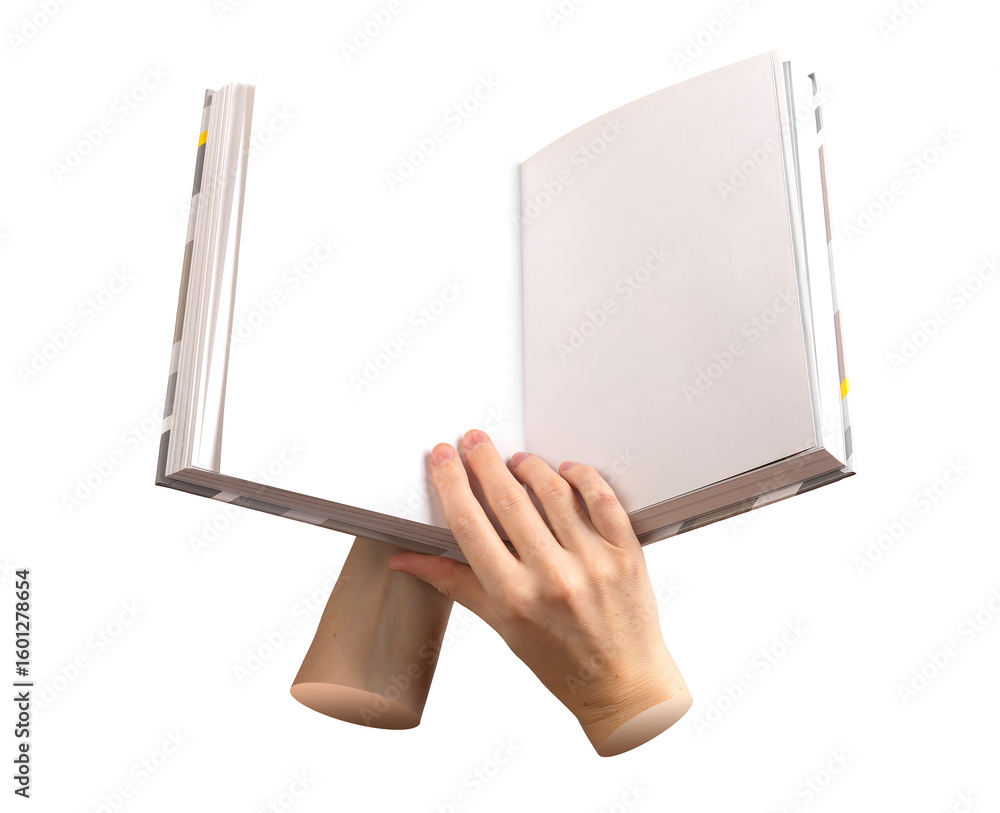 Literacy scene with open book. A hand holds the clean white pages, fully blank and textless,