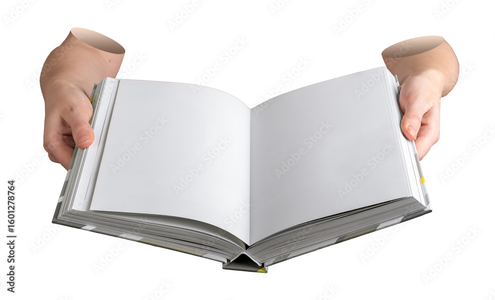 Education theme with hand holding book. The opened pages are white, clean, and blank, with a calm