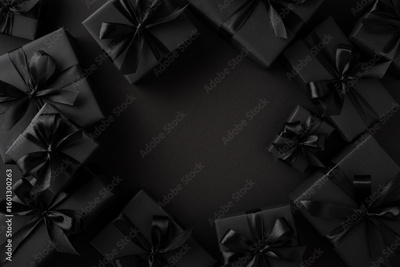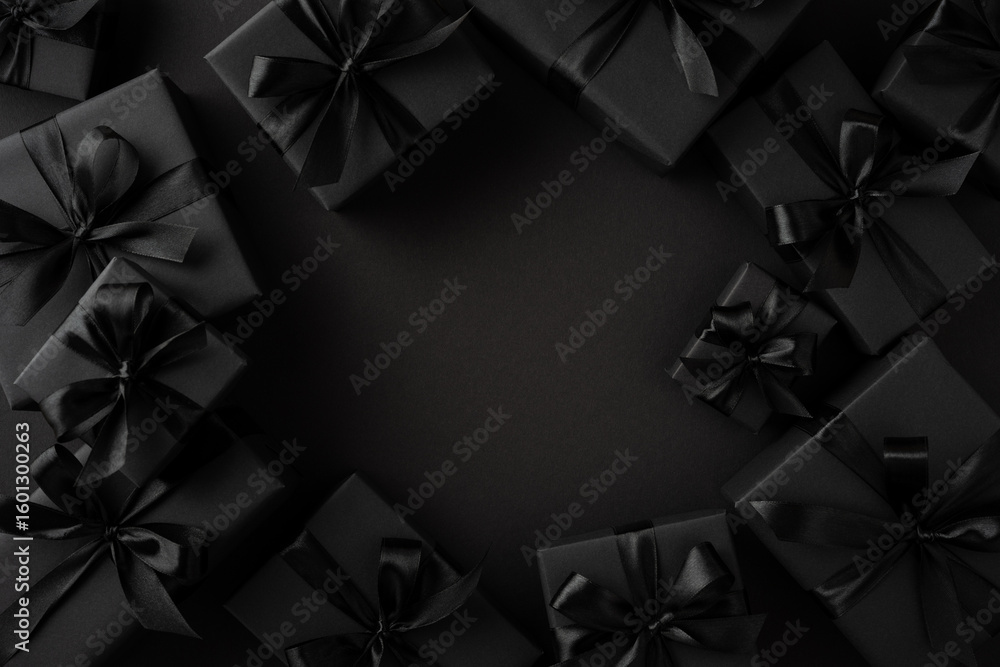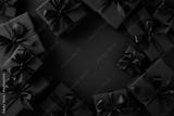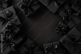 Sophisticated arrangement of black presents featuring sleek ribbons on a dark background, evoking luxury and celebration