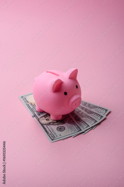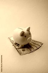House, buying or selling real estate, concept background with money and piggy bank. Real estate
