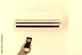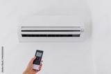 Air conditioner temperature adjustment with remote controller in room at home. Woman's Hand Using Air Conditioner Remote Control At Home