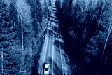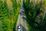 Aerial drone view of cars driving asphalt road through summer or fall woods