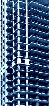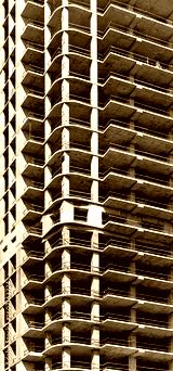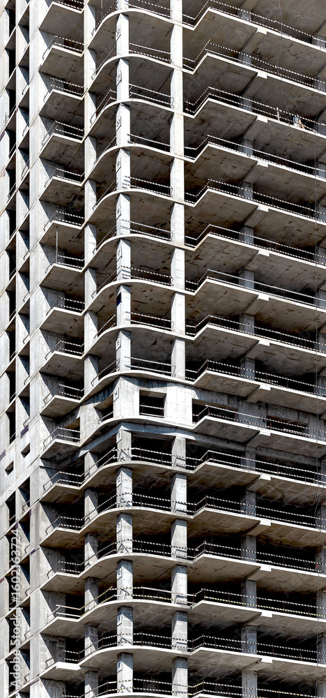 Construction of modern skyscraper. Tall condominium with geometric framework and balconies,