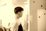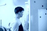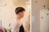 Young man with wireless earbuds looking into an open refrigerator at home. A casual, everyday scene depicting modern life and domestic routine.