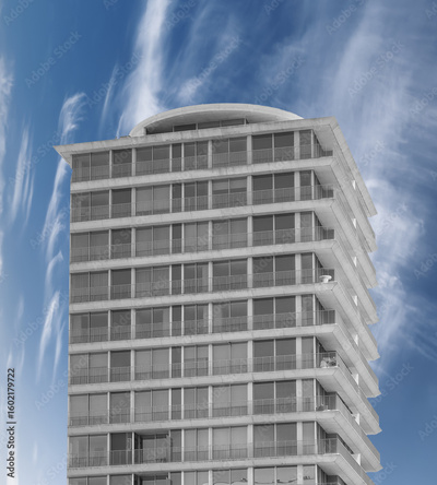 Apartment architecture with geometric design. Minimal modern highrise building with white and gray